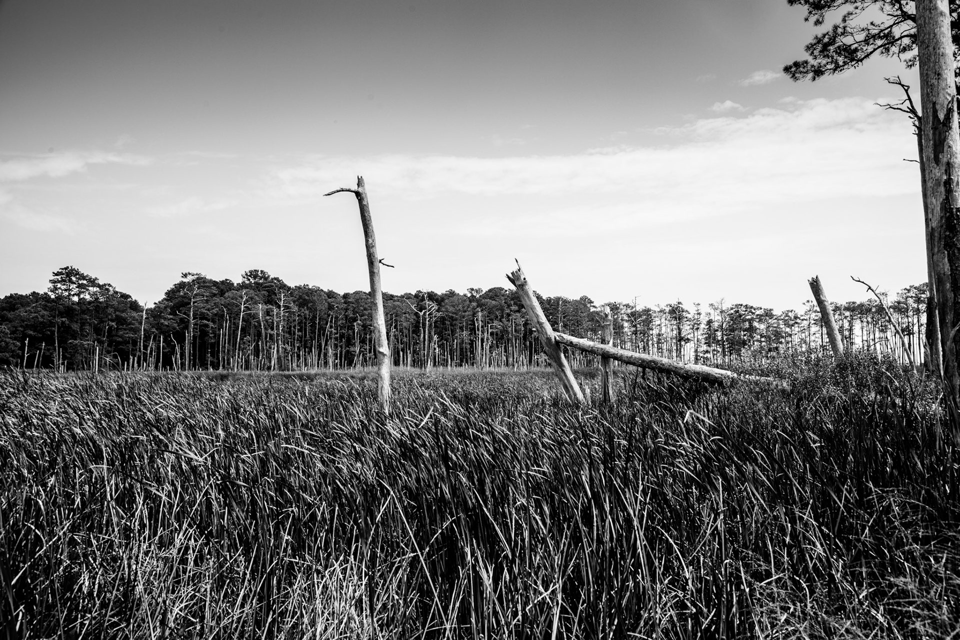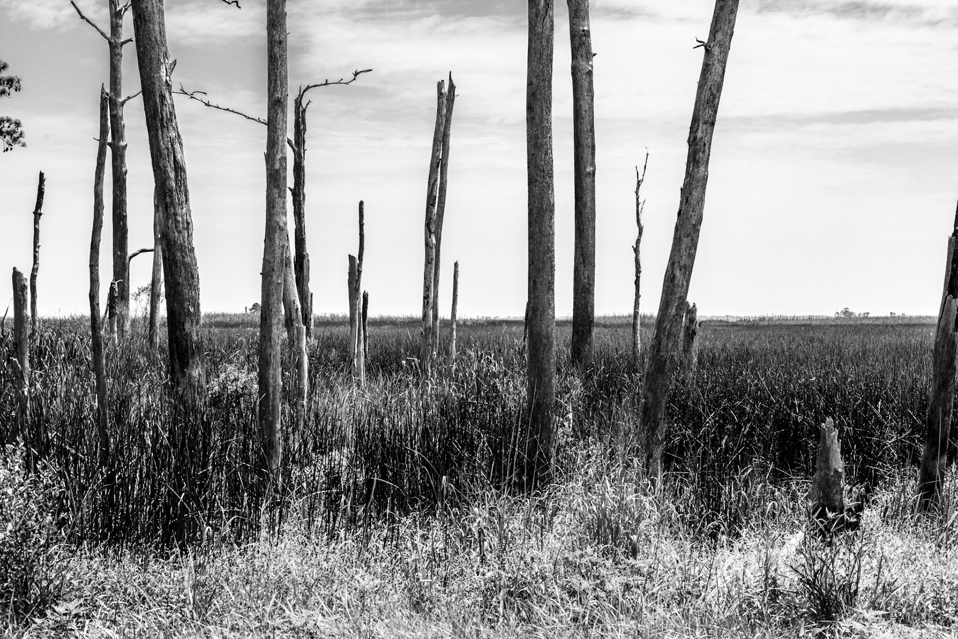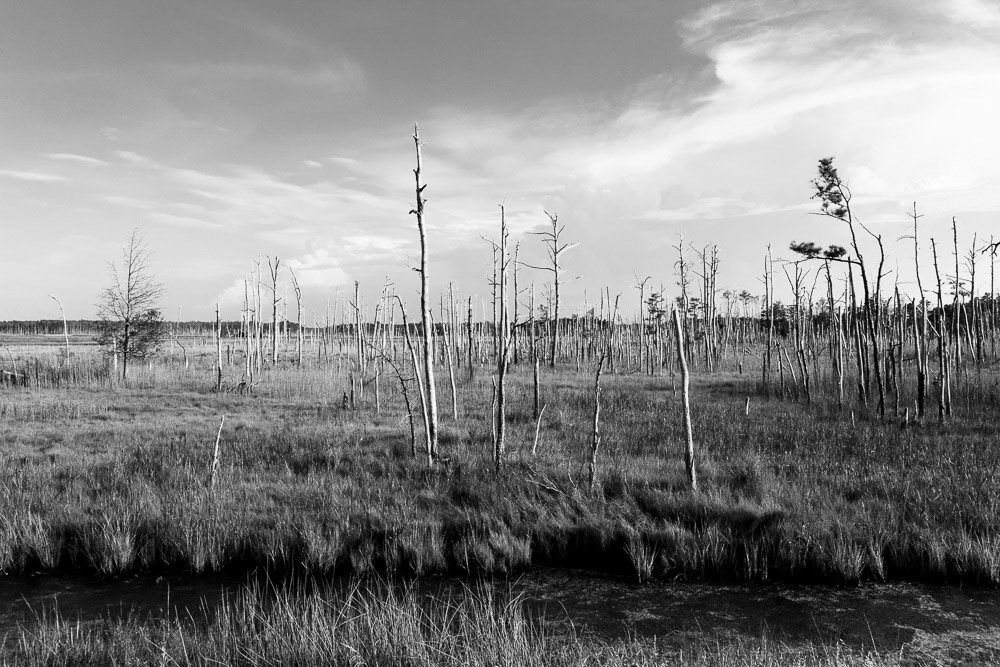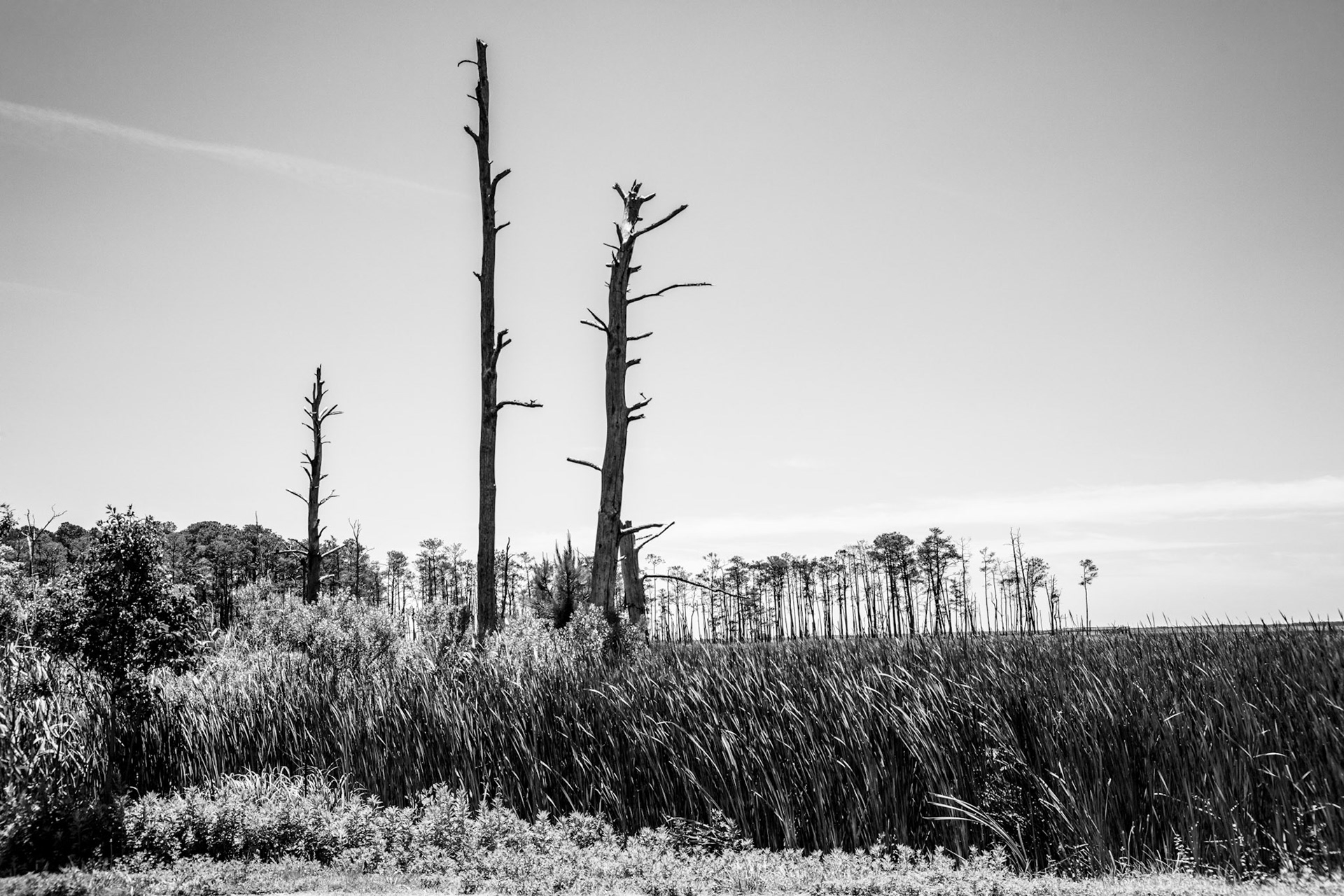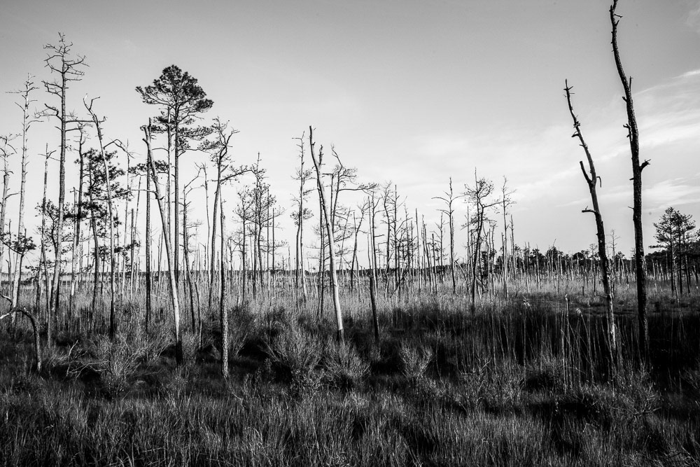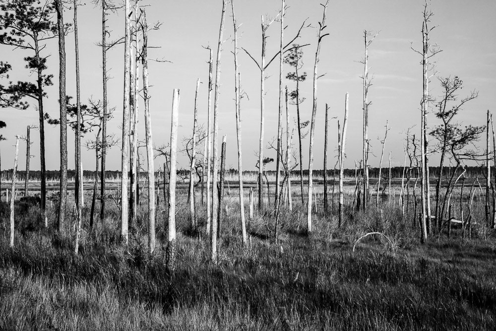 Ghost Forest is an ongoing project that uses photography to engage with the impact of climate change on the landscape. Created in the Chesapeake Bay watershed, these photographs explore coastal forest diebacks known as ghost forests. The Mid-Atlantic region of the United States is among the areas experiencing the fastest rate of sea level rise. As sea levels rise, saltwater encroaches upon coastal areas, leading to the death of trees and the transformation of the landscape into tidal marshes.