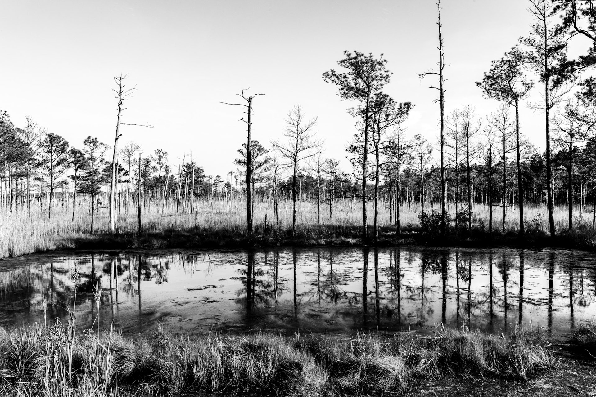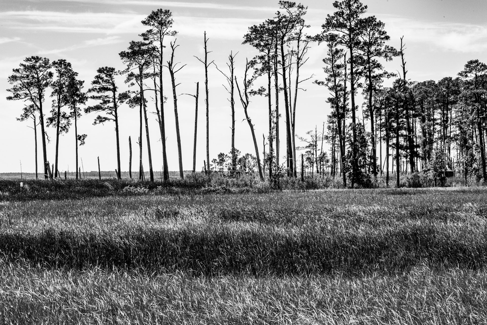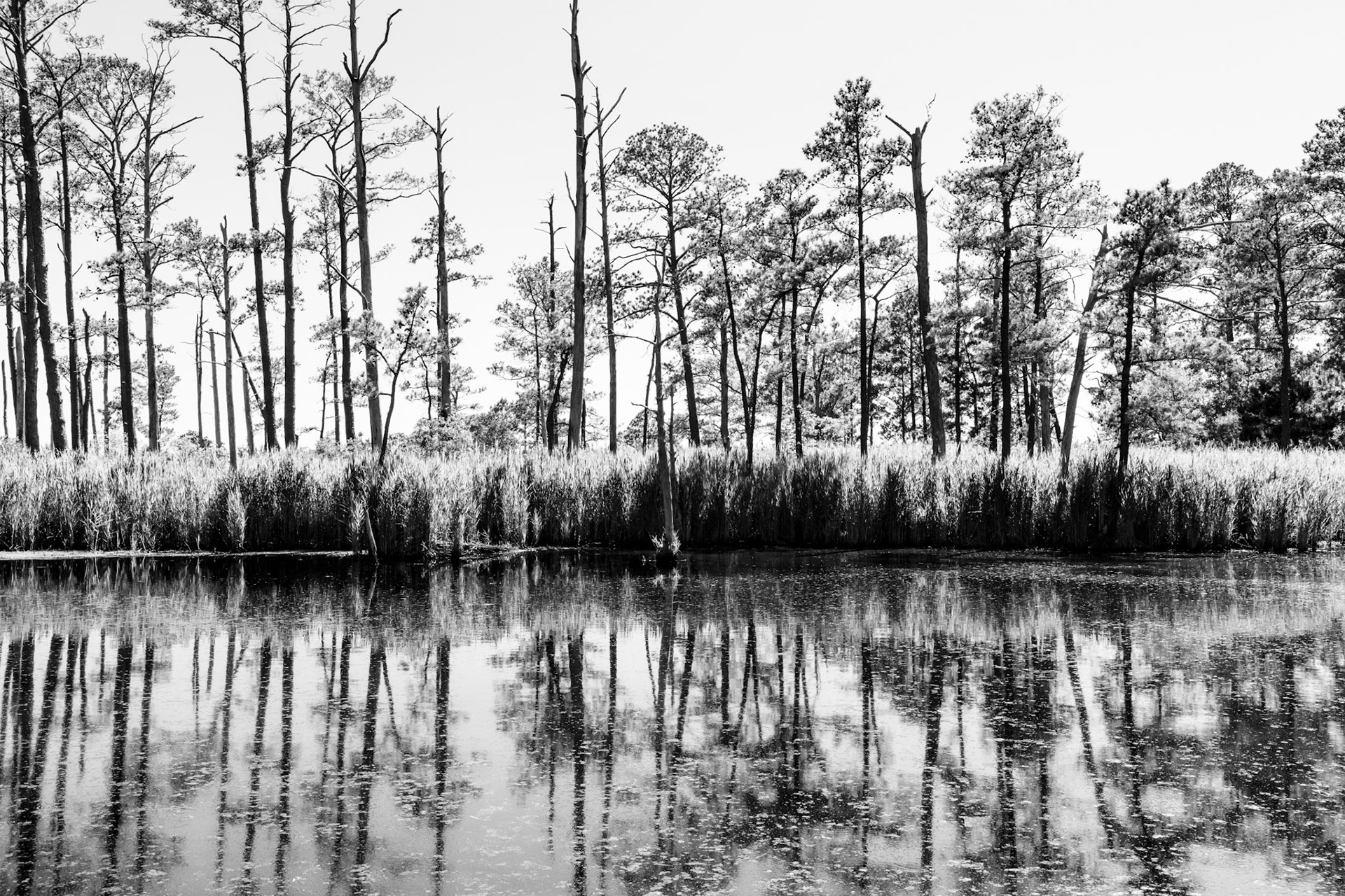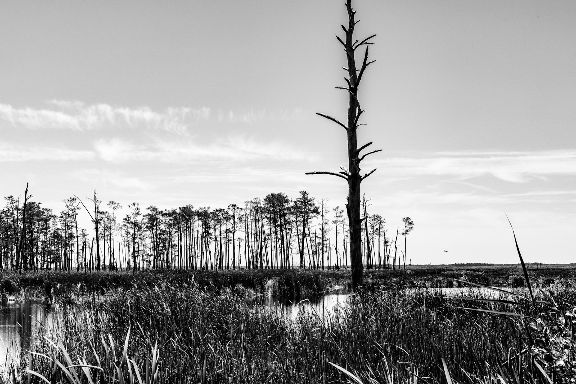 Ghost Forest is an ongoing project that uses photography to engage with the impact of climate change on the landscape. Created in the Chesapeake Bay watershed, these photographs explore coastal forest diebacks known as ghost forests. The Mid-Atlantic region of the United States is among the areas experiencing the fastest rate of sea level rise. As sea levels rise, saltwater encroaches upon coastal areas, leading to the death of trees and the transformation of the landscape into tidal marshes.