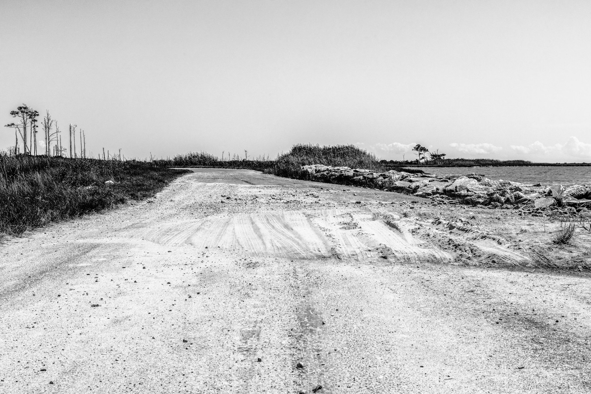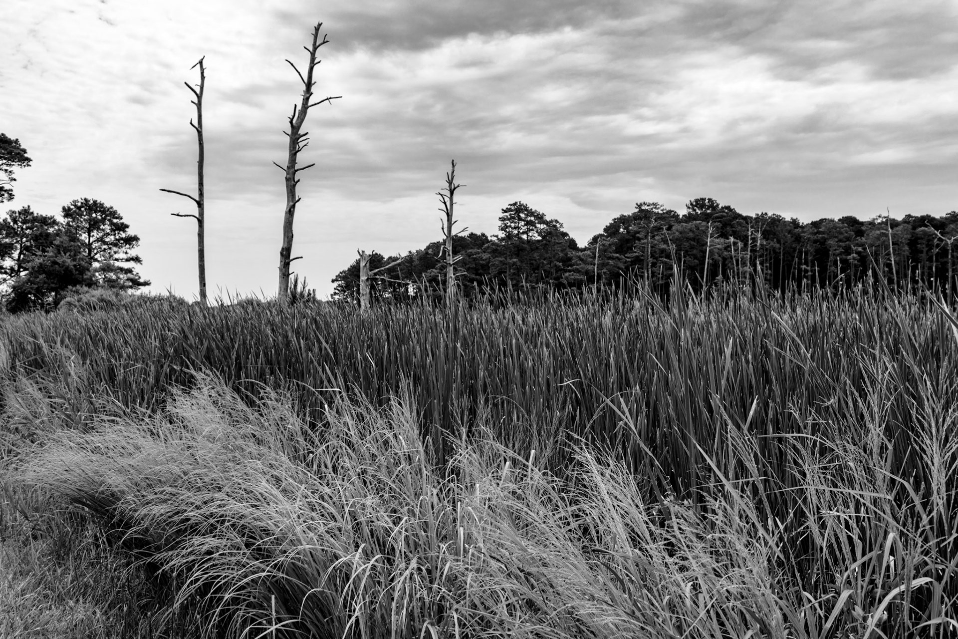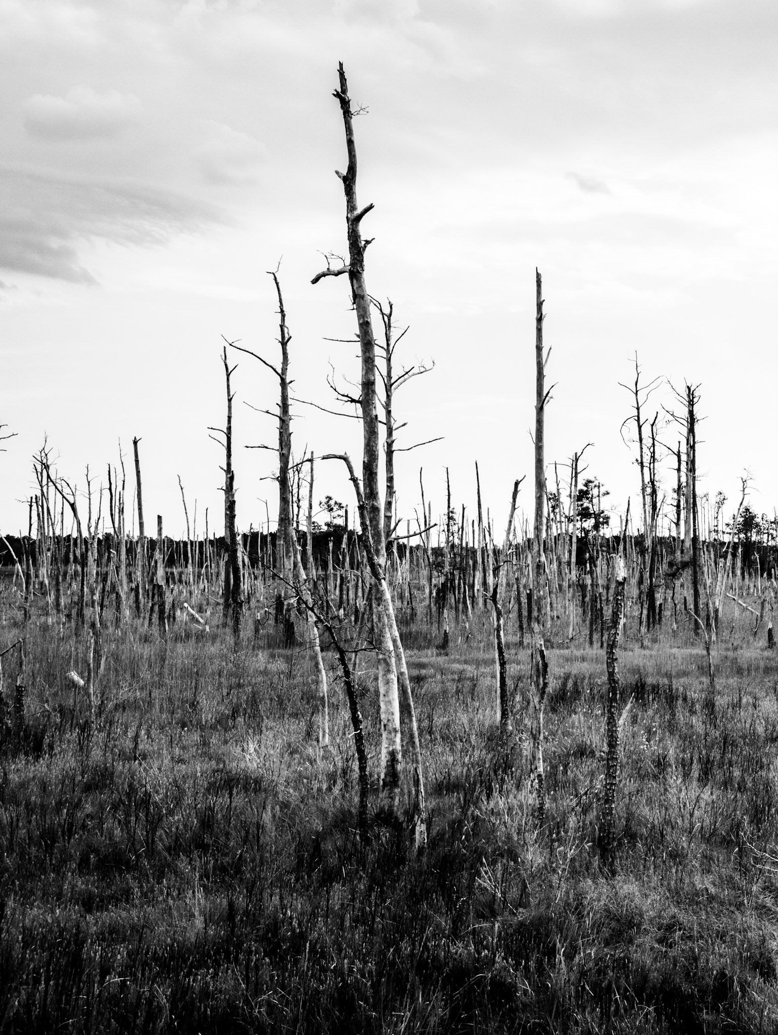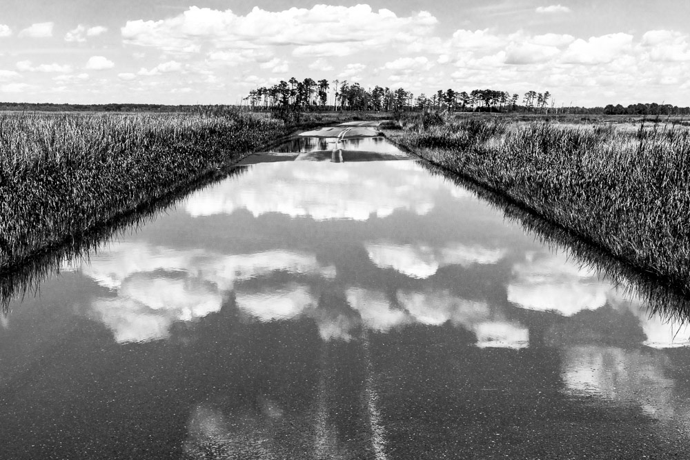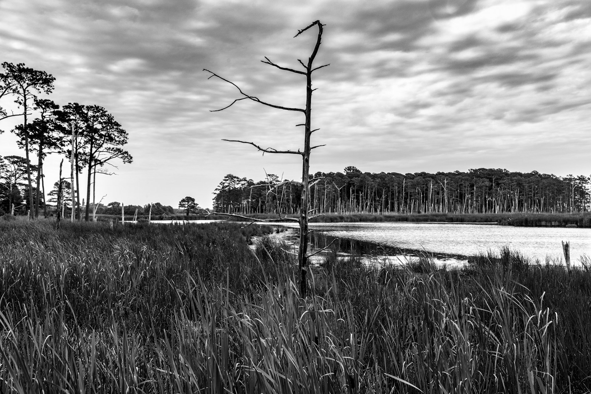 Ghost Forest is an ongoing project that uses photography to engage with the impact of climate change on the landscape. Created in the Chesapeake Bay watershed, these photographs explore coastal forest diebacks known as ghost forests. The Mid-Atlantic region of the United States is among the areas experiencing the fastest rate of sea level rise. As sea levels rise, saltwater encroaches upon coastal areas, leading to the death of trees and the transformation of the landscape into tidal marshes.
